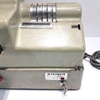 Affrancatrice Steiner matricola 5371 - anno di fabbricazione 1978 ditta produttrice O. Primavera di Milano Macchina affrancatrice postale in metallo di colore grigio elettrica. La macchina si presenta come un grosso parallelepipedo, è molto pesante e possiede linee arrotondate. Ad una estremità della macchina, si trova, parallelo al corpo principale della macchina stessa, il largo piatto rettangolare sul quale appoggiare le buste. Al fianco opposto della macchina si nota invece la manovella per mettere in funzione il meccanismo dell'affrancatura. Nella parte superiore della macchina si notano le quattro rotelle numeriche C00013344