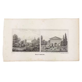 Antica litografia originale del XIX secolo raffigurante due vedute storiche di Mannheim: Die Sternwarte – l’osservatorio astronomico storico, circondato da paesaggio verde. Fu costruito tra il 1772 e il 1774, anno della sua inaugurazione. Das Neckarthor – la Porta del Neckar, con passanti, carrozze e vita cittadina Opera firmata da: J. Schütz fec. — autore/disegnatore e Lith. v. P. Wagner in Carlsruhe — litografo/editore Stampa su carta d’epoca con leggere fioriture, tipiche dei fogli originali del XIX secolo. Dimensioni cm. 24 x 13.5 In buone condizioni generali considerata l'età C00012425-804