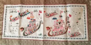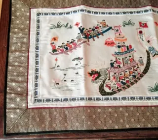 Splendido arazzo cinese antico, realizzato a mano in seta. Rappresentazione "100 Bambini in Dragon Boat" Dinastia Qing Retro in seta color verde Articolo raro, collezionismo antichità asiatica In condizioni impeccabili senza difetti, i colori del ricamo sono brillanti e nitidi Dimensioni cm 63x32 - Ricamo dettagliato raffigurante una scena fluviale con draghi e figure. - Bordi decorativi con motivi tradizionali. Antichità, arte, artigianato, design, quadro, ricamo, arazzo, tappeto, runner, tovaglia, arte orientale, Cina, seta ricamata, etnico, tribale, stoviglie, tavola