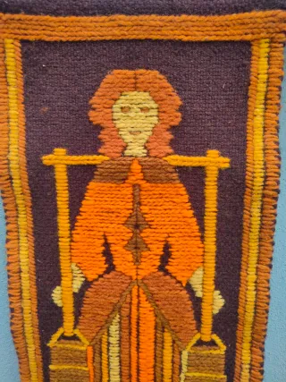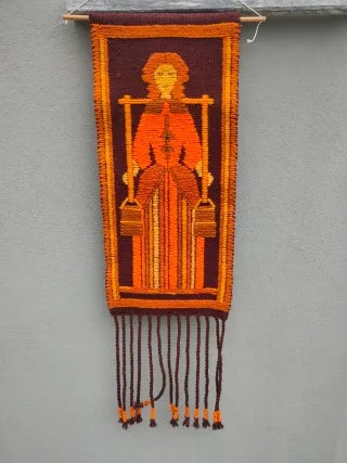 arazzo kilim polacco vintage, tappeto di lana degli anni '70, arazzo da parete di metà secolo, fatto a mano in Polonia, raffigurante una figura femminile. - Tessitura a mano. - Motivo decorativo con donna e cesti. - Frange decorative sul fondo. - Colori caldi: marrone, arancione, giallo. Dimensioni cm 97x30