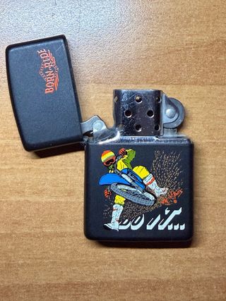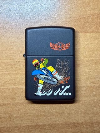 Accendino Zippo vintage con grafica Born to Ride e un motociclista. - Design nero opaco. - Grafica colorata con motociclista e testo DO IT.... - Modello Zippo vintage.