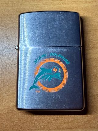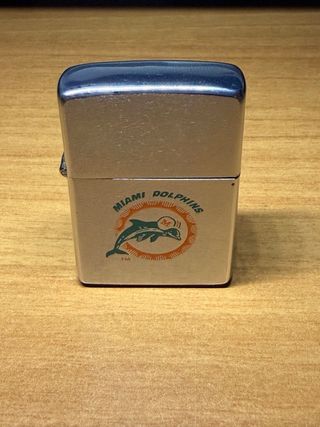 Accendino Zippo vintage con logo dei Miami Dolphins. Un pezzo da collezione raro degli anni '60 o '70. - Design in metallo spazzolato. - Logo dei Miami Dolphins con delfini e cerchio arancione.