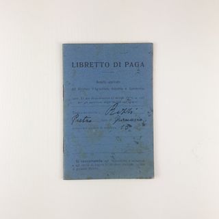 Libretto di paga originale, modello ufficiale approvato dal Ministero d’Agricoltura, Industria e Commercio nel 1904, utilizzato per la registrazione delle retribuzioni e delle assicurazioni dei lavoratori. 31 pagine, con copertina originale in cartoncino azzurro e interni stampati tipograficamente, arricchiti da annotazioni manoscritte d’epoca che ne attestano l’effettivo utilizzo. Sono presenti tabelle per i pagamenti mensili, firme, dati anagrafici del lavoratore e riferimenti normativi relativi agli infortuni sul lavoro, rendendolo un documento di grande valore storico e sociale. C00007329-624