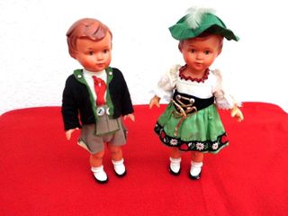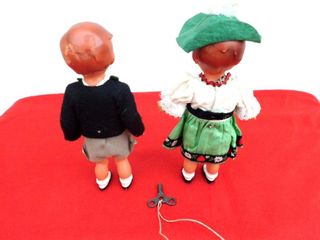 Rara coppia di bambole meccaniche tedesche d’epoca, realizzate in celluloide, complete di meccanismo a molla funzionante (con chiave originale) e abiti tradizionali folkloristici.Le bambole raffigurano un ballerino e una ballerina in costume tipico alpino/bavarese: lei con vestito verde ricamato e cappello piumato, lui con giacca nera, pantaloni corti e cravatta rossa. Gli abiti appaiono originali, ben conservati per l’età, con normali segni del tempo. Volti dipinti a mano, proporzioni armoniose e grande fascino decorativo. anni 30/40 chiavetta presente C00000402-802