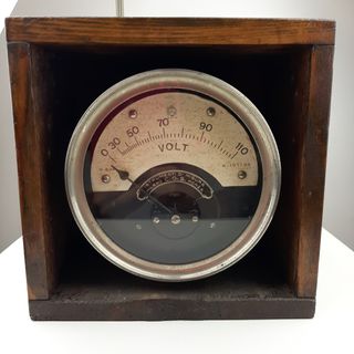Voltmetro con scatola in legno Marca C.G.S MONZA scala 0- 110 volt Dimensioni scatola legno cm. 22 X 22 X 14.5 Diametro voltmetro cm. 15 non testato da esposizione e/o collezione C00008279-802