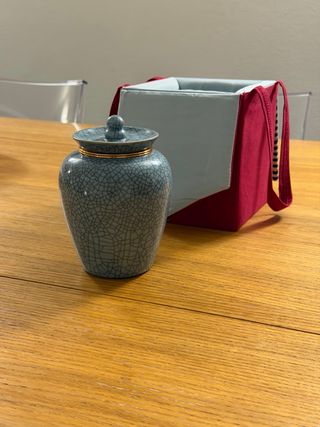 Elegante vaso cinese con finitura craquelé, ideale per conservare tè o come oggetto decorativo. Viene fornito con una scatola coordinata e sacchetto sigillato con the verde - Vaso in ceramica con finitura verde craquelé. - Dettagli dorati sul coperchio e sul bordo. - Include una scatola di presentazione.