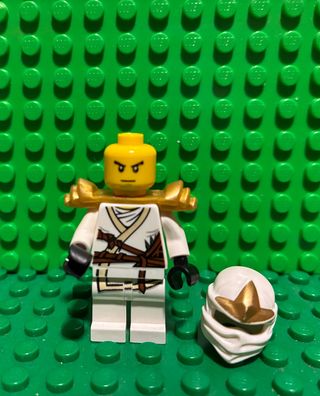 Personaggio LEGO Zane ZX, codice njo0053, della serie Ninjago. - Testa con maschera bianca e dettagli dorati. - Corpo con stampa di abiti bianchi e marroni. - Spallacci dorati. - Mani nere.