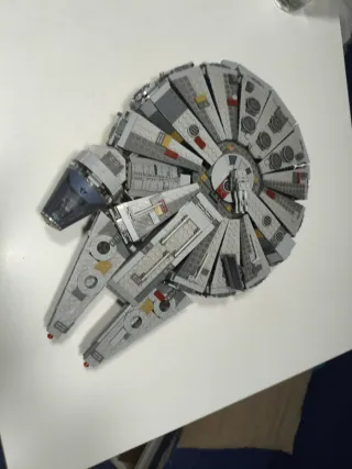 Modello del Millennium Falcon di Lego Star Wars. - Parti in plastica grigia e dettagli in rosso e giallo. - Cabina di pilotaggio con cupola trasparente.