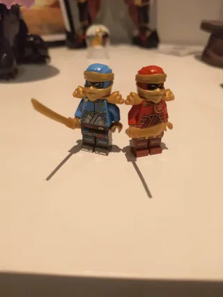 Figure Lego dei personaggi Nya e Kai di Ninjago. Nya con costume blu e spada dorata. Kai con costume rosso e dettagli dorati. Perfette.