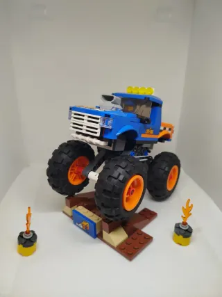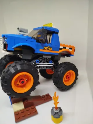 Camion mostro Lego City 60180. - Camion di colore blu con dettagli arancioni. - Grandi ruote di gomma con cerchioni arancioni. - Include rampa e ostacoli di fuoco. Completo di pezzi, adesivi e minifigura. Senza manuale (si scarica dal web senza difficoltà). Eventuali domande verranno risposte.