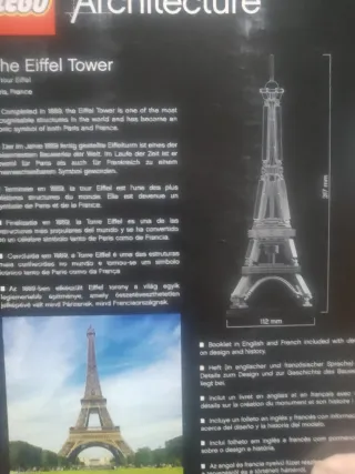 Modello LEGO Architecture della Torre Eiffel, un'icona di Parigi. - Include un libretto con dettagli sul design e la storia. - Dimensioni del modello: 112 mm di larghezza. - Altezza del modello: 317 mm.