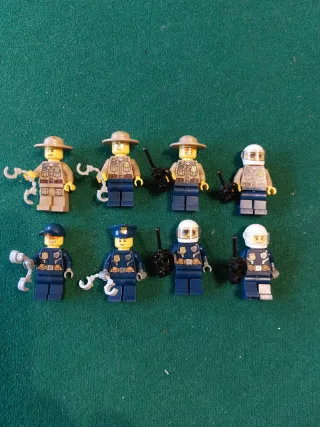 Set di 8 minifigure Lego a tema polizia. - Figure con cappello da ranger. - Figure con cappello da poliziotto. - Figure con casco da motociclista. - Accessori inclusi come manette e walkie-talkie. Pacco prenotato per aaronortbermjo
