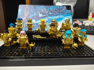 Set di 12 action figure dorate dei Cavalieri dello Zodiaco, compatibili con mattoncini tipo Lego. Le figure sono realizzate in plastica dorata e presentano dettagli curati. - 12 personaggi inclusi. - Design ispirato ai Cavalieri dello Zodiaco. - Colore predominante oro.