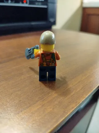 Minifigure Lego originale, modello Hol109, con accessori. - Figura con cappello beige. - Indossa una giacca arancione con dettagli. - Pantaloni blu. - Accessorio a forma di sega circolare. Bellissimo come da foto visto e piaciuto
