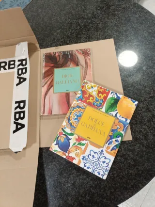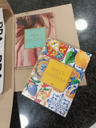 Due libri sulla moda, uno dedicato a Dolce & Gabbana e l'altro a Dior Galliano. - Libro Dolce & Gabbana con design ispirato ai piastrelli. - Libro Dior Galliano con copertina alla moda. RBA