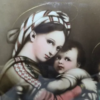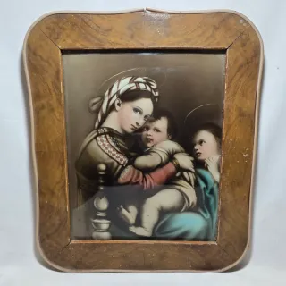 Quadro raffigurante Madonna della Seggiola di Raffaello Sanzio, risalente al '900. Smontato si vede una cartoncino incollato su un vetro. Si trova in buone condizioni generali. Lievi segni di usura. Cornice presenta puntini di vernice bianca, da rimuovere. Misure totali: 39 x 32,5 circa antiquariato libro antico libri rari manoscritto limitata prima edizione scultura statua busto bronzo marmo ceramica dipinto quadro pittura arte antica olio su tela telaio cornice dorata legno intagliato mobili antichi armadio specchiera originale raro collezione restaurato autentico decorazione d'epoca antiqui