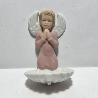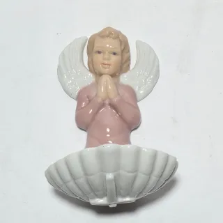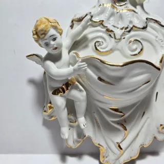 Acquasantiera in ceramica bianca e oro con putto
