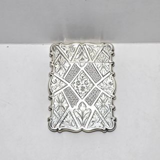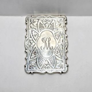 Antico Porta Carte Inglese in Argento Sterling (925) risalente al XIX Secolo (1873). Il corpo dell'oggetto è completamente cesellato a mano con motivi floreali e geometrici. Il perimetro è tutto a volute, molto particolare e lavorato. Monogramma KR al fronte. Punzone presente dentro alla battuta del coperchio. GU George Unite - Y = 1873 - Ancora: Birmingham - Leone Passante - Sovereign head . Misure: 10.1 x 7.5 x 0.8 cm Ca. antiquariato libro antico libri rari manoscritto limitata prima edizione scultura statua busto bronzo marmo ceramica dipinto quadro pittura arte antica olio su tela telaio cornice dorata legno intagliato mo