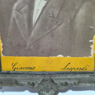 Rara riproduzione fotografica di un dipinto raffigurante Giacomo Leopardi realizzata dal fotografo Alfonso Balelli di fine XIX secolo. La foto si trova entro la sua cornice in metallo dell'epoca. Si trova in buone condizioni generali. Presenta dei segni del tempo. La foto risulta un po' rovinata nei bordi. La parte inferiore è un po' rifilara. Vedere foto. Misure totali: 21,5 x 14,5 cm circa antiquariato libro antico libri rari manoscritto limitata prima edizione scultura statua busto bronzo marmo fotografia ceramica dipinto quadro pittura arte antica olio su tela telaio cornice dorata legno intagliato mobili antichi armadio sp