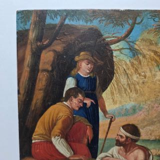 Pittore di ambito nord-europeo (scuola fiamminga o germanica), olio su tavola di quercia (rovere), seconda metà del XIX secolo. Raffigurante scena di genere di gusto italianizzante. Il dipinto rappresenta tre soggetti, probabilmente pastori che riposano in un ambiente naturale. Su sfondo fluviale. Misure: 23.3 x 17 x 0.7 cm Ca. Ottime condizioni, piccola crepa di riattaccatura nel settore basso destra. (foto) antiquariato libro antico libri rari manoscritto limitata prima edizione scultura statua busto bronzo marmo ceramica dipinto quadro pittura arte antica olio su tela telaio cornice dorata legno intagliato mobili antichi