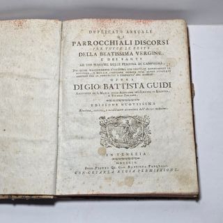 TITOLO: Duplicato Annuale di Parrocchiali Discorsi per tutte le feste della beatissima Vergine e Dei Santi .... Gio: Battista Guidi ... Venezia 1804 Pasquali. Coperta in mezza pergamena con piatti decorati con stelle dipinte, titolo manoscritto al dorso. Tagli Spruzzati Interno in buono stato di conservazione con rare macchie o fioriture. Misure: 23.4 x 18 x 2.2 cm Ca. Pagine: (1) IV ; 298 (1). libri antichi libro antico libri rari libri storici libri da collezione libro da collezione antiquariato libri antiquariato collezionismo librario arte antica cultura antica vendita libri antichi antique books ancient book rare books hi