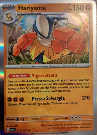 Carta Pokémon Hariyama Fase 1. - Abilità: Vigorcattura - Attacco: Pressa Selvaggia - Debolezza: x2 - Resistenza: Nessuna - Costo di Ritirata: Tre Energie - Illustratore: GOSSAN - Numero carta: 073/132