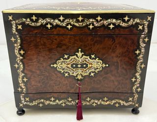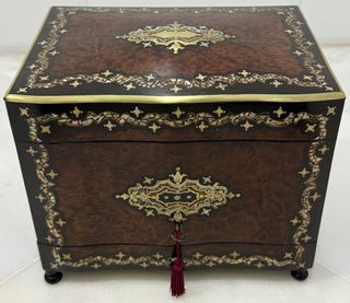 Splendido e unico armadio per liquori di origine francese della metà del XIX secolo, stile Boullé Napoleone III, realizzato in legni pregiati come rosa e thuja con un raffinato lavoro di intarsio e intarsi in ottone dorato, madreperla e materiali naturali. Un vero gioiello unico in eccellente stato di conservazione per la sua età e utilizzo. Piccola restaurazione per farlo brillare di tutto il suo splendore! Vedere le foto per una migliore idea dei dettagli descritti. Dimensioni: 28 cm di altezza, 33 cm di larghezza e 24 cm di profondità. SPEDIZIONE CON TRASPORTO E IMBALLAGGIO PROFESSIONALE.