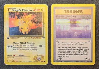 Vendo coppia di carte Pokémon originali del set vintage "Gym Heroes" (anno 2000), entrambe in versione 1ª Edizione (simbolo 1st Edition presente). Il lotto comprende: Lt. Surge's Pikachu (84/132) - Condizioni: Danneggiata (presenta pieghe evidenti come da foto, ideale per chi vuole completare il set senza spendere molto o per amatori del personaggio). Fuchsia City Gym - Stadio (114/132) - Condizioni: Ottime/Eccellenti. Carta ben conservata, bordi definiti e superficie pulita. #Pokemon #WOTC #Pikachu #GymHeroes #Vintage #PokemonCards #FirstEdition