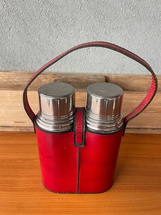 Set vintage da viaggio Tea & Coffee, Made in Italy, composto da due termos in alluminio con custodia rigida in vero cuoio rosso. Oggetto d’epoca anni ’50–’70, ideale per collezionisti, amanti del design retro o per arredamento vintage. La custodia è in cuoio rosso interamente cucito a mano, con scritte dorate “Tea” e “Coffee” e manico originale. I due contenitori sono in alluminio sia esterno che interno, con unica fascia in plastica rosa originale. Custodia in cuoio: ottime condizioni, integra, cuciture perfette. Termos: buone condizioni vintage, presenti un po’ di ossidazione. Dimensioni custodia: Altezza 19 cm Larghezza 14 cm
