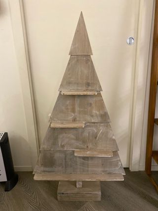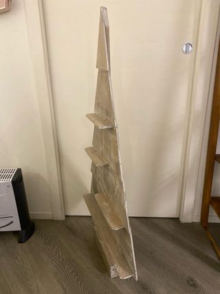 Albero espositore in legno, perfetto per decorazioni natalizie. - Altezza: 122 cm - Materiale: Legno grezzo con finitura sbiancata - Design a più ripiani