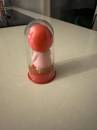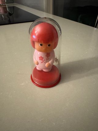 Profumina Sebino originale degli anni '80, profumatore con fragranza alla fragola. - Design vintage. - Contenitore in plastica trasparente con base rossa. - Bambolina con capelli rossi e vestito rosa decorato con fiori. - Non profuma più di fragola.