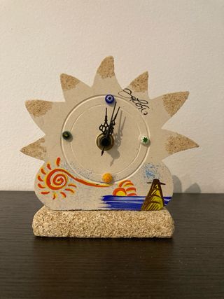 Orologio da tavolo decorativo a forma di sole, realizzato in ceramica e pietra leccese. - Design unico a forma di sole. - Base in pietra leccese. - Decorazioni dipinte a mano.