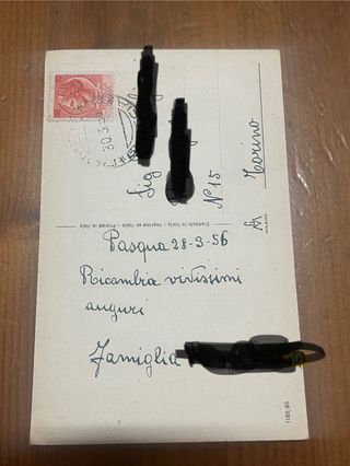 Cartolina d'epoca con disegno a tema Pasqua e Lambretta. - Illustrazione di due bambini su una Lambretta con un uovo di Pasqua. - Cornice decorata con uova colorate. - Scritta Buona Pasqua in oro.i i dati sono stati cancellati per poterla inserire tra le foto
