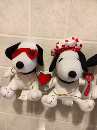 Set di 4 peluche Snoopy a tema San Valentino. - Snoopy con occhiali a cuore e cuore rosso. - Snoopy chef con cappello a cuore e spatola. - Snoopy con bouquet di rose. - Snoopy con sciarpa rossa. 20€ per ciascuna coppia