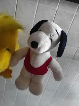 Lotto di peluche di Snoopy e Woodstock. - Peluche di Snoopy con cappello natalizio e Woodstock in testa. - Peluche di Woodstock con zampe gialle. - Peluche di Snoopy con costume da bagno rosso.