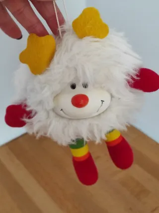 Peluche del folletto Iridella, personaggio di Rainbow Brite. - Morbido e soffice materiale bianco. - Dettagli colorati come naso rosso, guance rosa e stelle gialle. - Piedi e mani rossi. - Gambe con strisce arcobaleno.