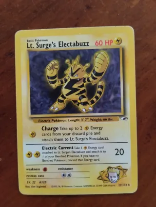 Carta Pokémon Lt. Surge's Electabuzz del set Base Set 2. - Pokémon Base. - Numero 27/132. - Illustratore: Ken Sugimori. - HP: 60. - Attacco: Charge. - Attacco: Electric Current. - Debolezza: Fulmine. - Resistenza: Combattimento. - Costo di ritirata: 2.