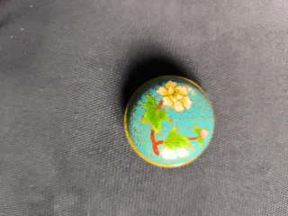 Elegante scatolina rotonda in cloisonné, decorata con un motivo floreale. - Design con fiore giallo e foglie verdi. - Sfondo turchese con motivo a rete. - Bordi dorati.