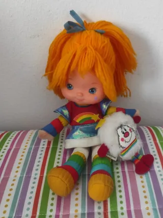 Bambola Iridella di Rainbow Brite, prodotta da Mattel, con il suo folletto. - Capelli arancioni vivaci. - Vestito colorato con arcobaleno e stella. - Calzini a righe arcobaleno.