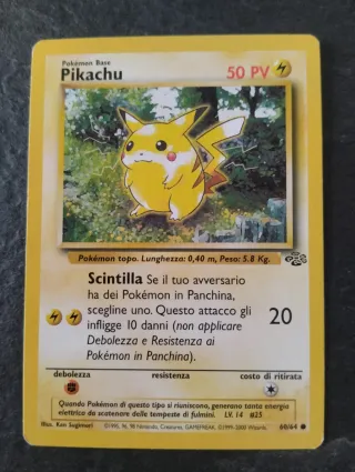 Carta Pokémon Base di Pikachu, numero 60/64. - Illustrazione di Ken Sugimori. - Attacco: Scintilla, infligge 10 danni. - Livello 14. - Costo di ritirata: 1 energia.