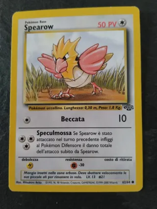 Carta Pokémon Base di Spearow, numero 62/64. - Attacco: Beccata - Attacco speciale: Speculmossa - Debolezza: Fulmine - Resistenza: Lotta - Costo di ritirata: 1 - Livello: 13
