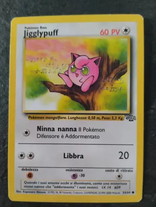 Carta Pokémon Base Set di Jigglypuff. Un classico per collezionisti. - Pokémon: Jigglypuff - Tipo: Base Set - PV: 60 - Attacco: Libbra (20) - Debolezza: Resistenza (30) - Costo di ritirata: 1 - Illustratore: Kagemaru Himeno