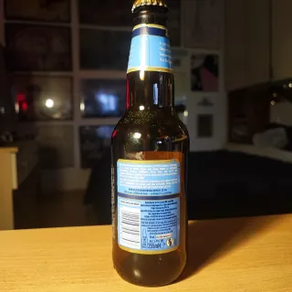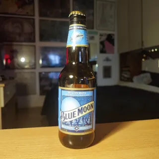 Bottiglia di birra Blue Moon vuota. - Etichetta Belgian White Belgian Style Wheat Ale. - Capacità 12 FL. OZ. (355ml). - Gradazione alcolica 5.4% VOL.