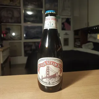 Bottiglia di birra Anchor Steam vuota, un pezzo da collezione. - Etichetta Anchor Steam Beer con il Golden Gate Bridge. - Tappo blu. - Prodotta da Anchor Brewing Co., San Francisco.