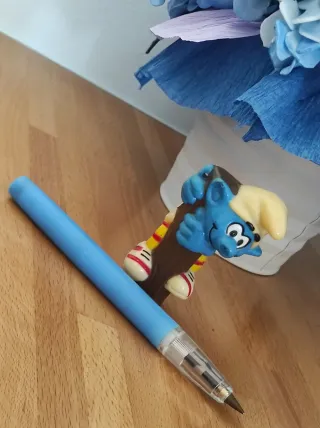Penna vintage dei Puffi, un pezzo da collezione per gli appassionati. - Design colorato con personaggio dei Puffi. - Corpo della penna blu. - Cappuccio trasparente con dettagli metallici. Unica nel suo genere. 🤩 Al momento non scrive ma forse sostituendo la cartuccia potrebbe anche funzionare. Lascio a voi la gioia di provare 🤣 Io sono una pasticciona....non vorrei rovinarla 😅