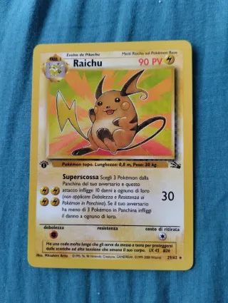 Carta Pokémon di Raichu, 1 edizione. - Numero carta: 29/62 - PV: 90 - Attacco: Superscossa - Debolezza: 4 - Resistenza: 30 - Costo di ritirata: 1 - Illustratore: Mitsuhiro Arita