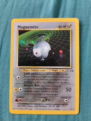 Carta Pokémon Magnemite, holo. - HP: 40 - Tipo: Base Pokémon - Attacco: Lock-on, Electric Bolt - Costo di ritirata: 1 - Numero carta: 7/75
