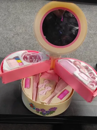 Beauty case vintage per bambini, un set da gioco completo per la cura della persona. - Include specchio rotondo apribile. - Contiene accessori come pettini, spazzole e bigodini. - Design colorato con decorazioni floreali e farfalle. Super vintage da collezione ormai