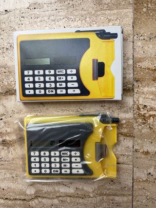 Calcolatrice tascabile dal design vivace e compatto, completa di penna integrata. - Colore: Giallo - Tasti numerici e funzioni base - Funziona a energia solare - Penna inclusa