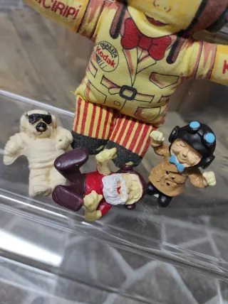 Pupazzo vintage a tema Kodak, con scritta CIRICIRIPPI su un braccio e KODAK sull'altro. Indossa un elmetto da aviatore e una tuta gialla con pantaloni a righe. - Pupazzo in stoffa. - Dettagli stampati sulla tuta. - Include tre piccole statuine aggiuntive: un mummificato, un Babbo Natale e un personaggio con elmetto da aviatore.
